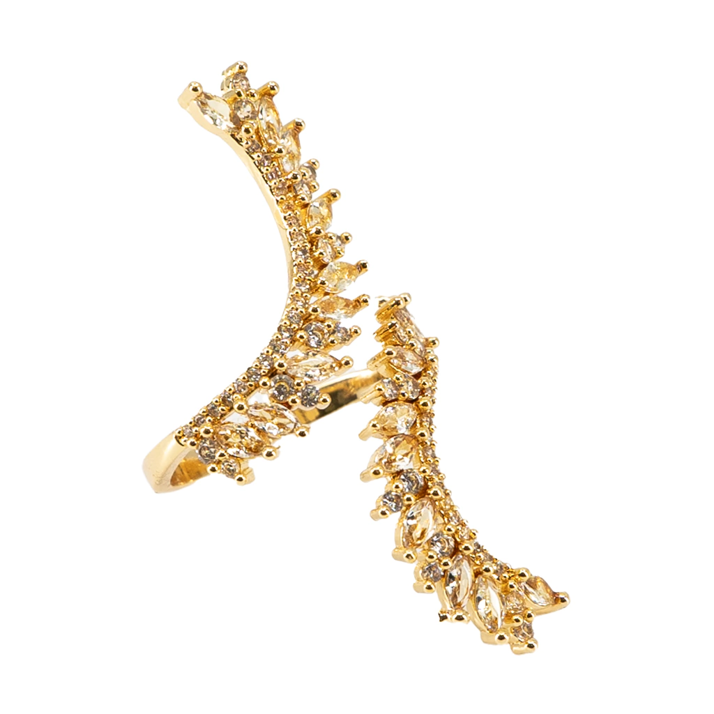 Anillo con forma de alas, muy original de baguetines de cubic zirconia el tonos de su base dorado y translucido. Muy luminoso. Todas nuestras piezas son únicas y exclusivas de Las Juanas Night.