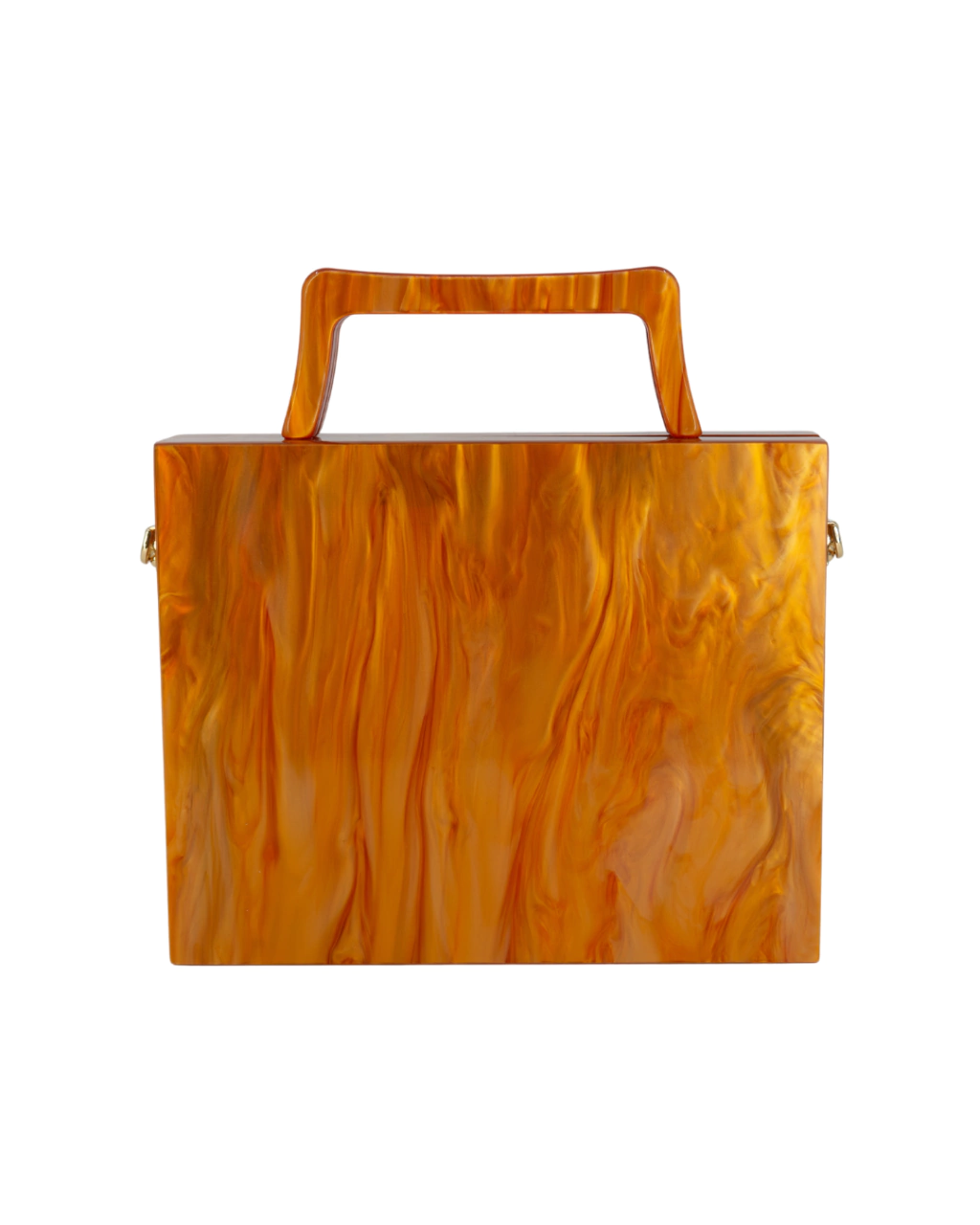 Clutch de diseño estructurado y atemporal, con una textura marmolada que lo convierte en una verdadera pieza de colección. Ideal para elevar cualquier look, de día o de noche.