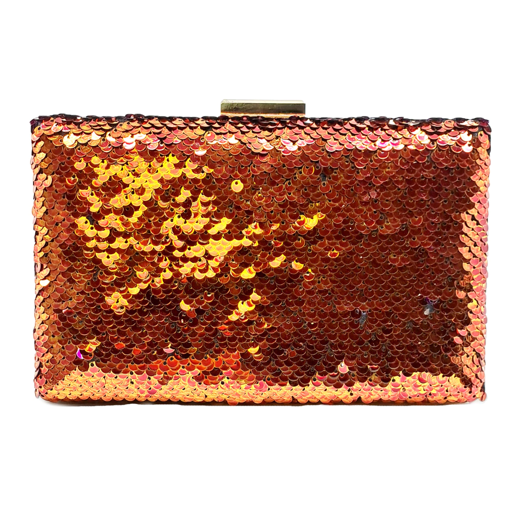 Clutch de paillet todo bordado en paillet cobrizo de ambos lados, en formas de lluvia y un broche de metal en tono plata rectangular para cerrar, para complementar todo tipo de look. Todos nuestros productos son únicos y exclusivos de Las Juanas Night.