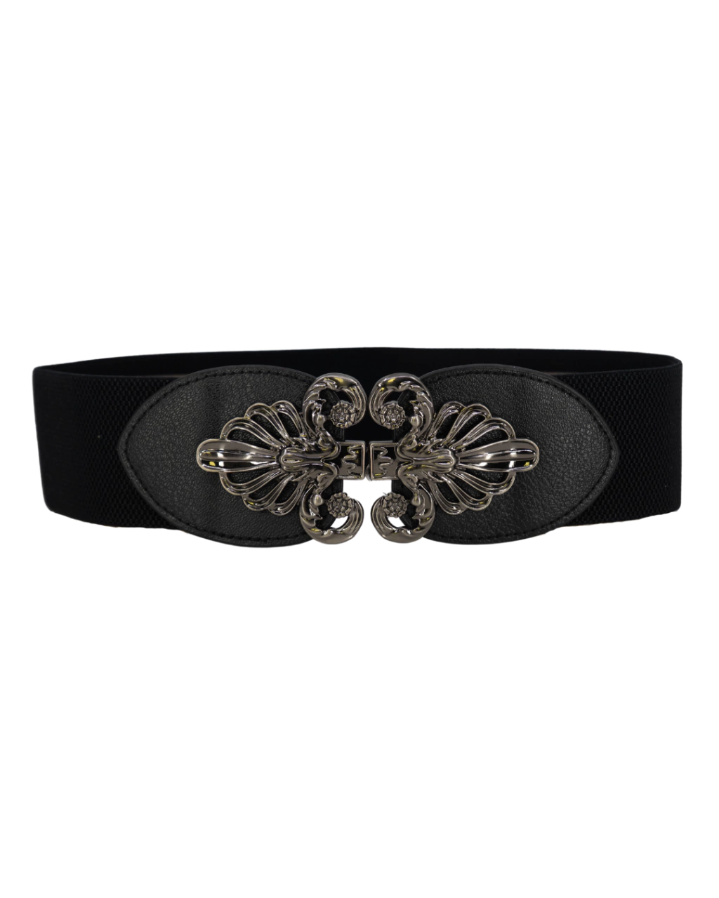 La Faja Roberta destaca por su hebilla en forma de arabesco, un diseño muy canchero que aporta un toque sofisticado y moderno a cualquier conjunto. Su material elástico negro asegura un ajuste perfecto, ideal para acompañar desde vestidos hasta pantalones de estilo casual o formal.