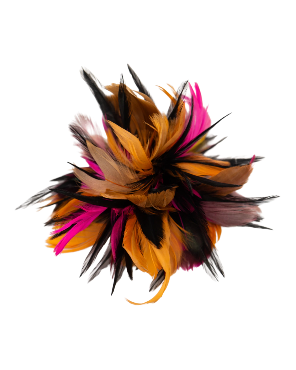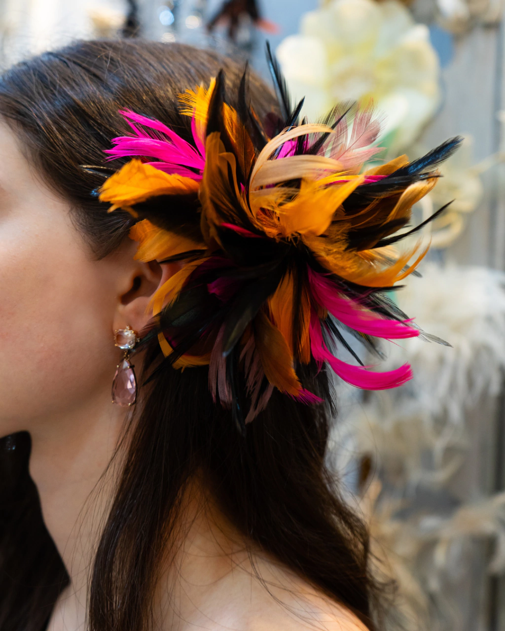 280Material: El Tocado de Pluma está elaborado con plumas naturales de alta calidad, disponibles en vibrantes colores fucsia, negro y naranja. Este accesorio destaca por su originalidad y elegancia, perfecto para quienes buscan un toque distintivo en su look.